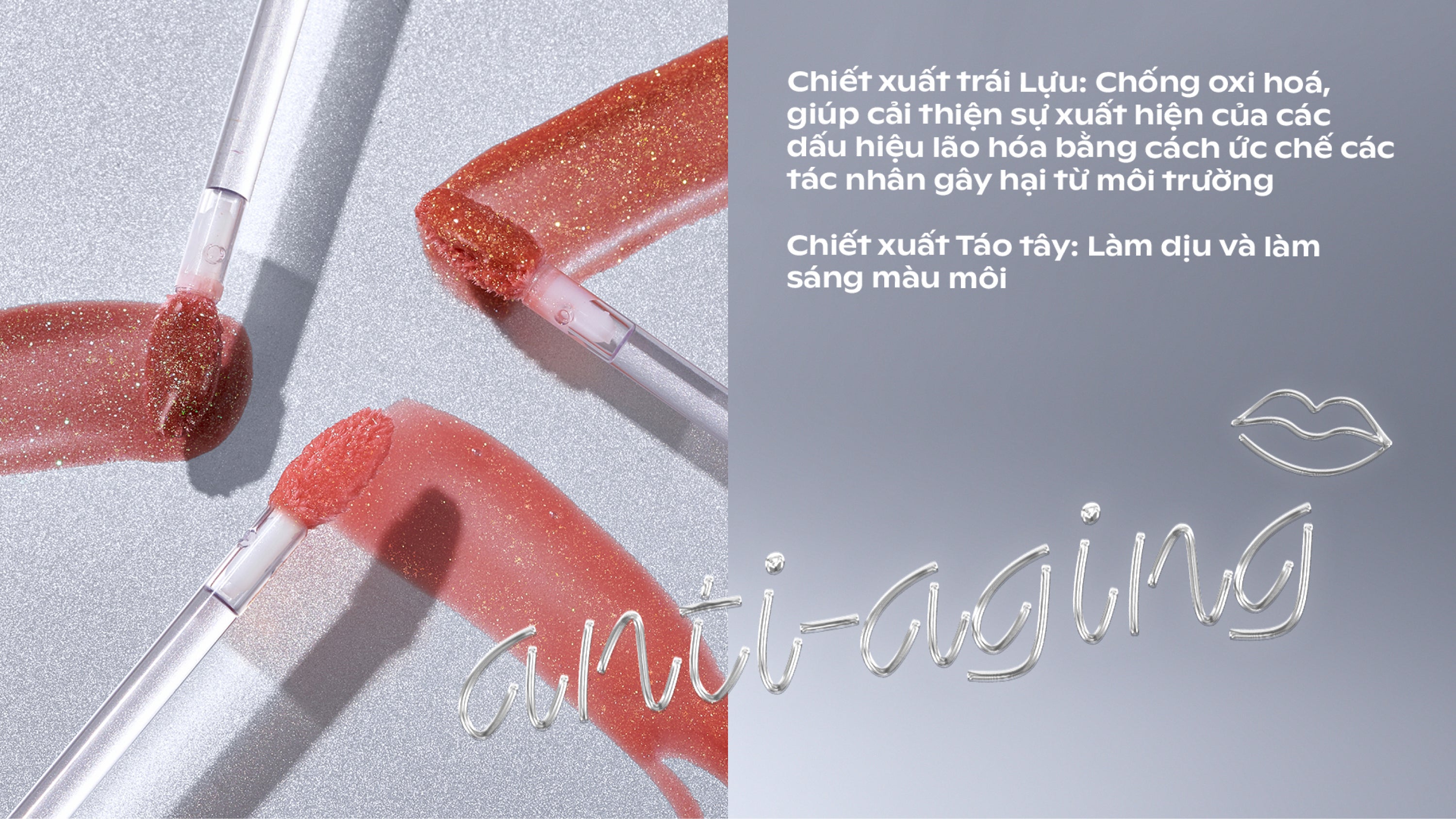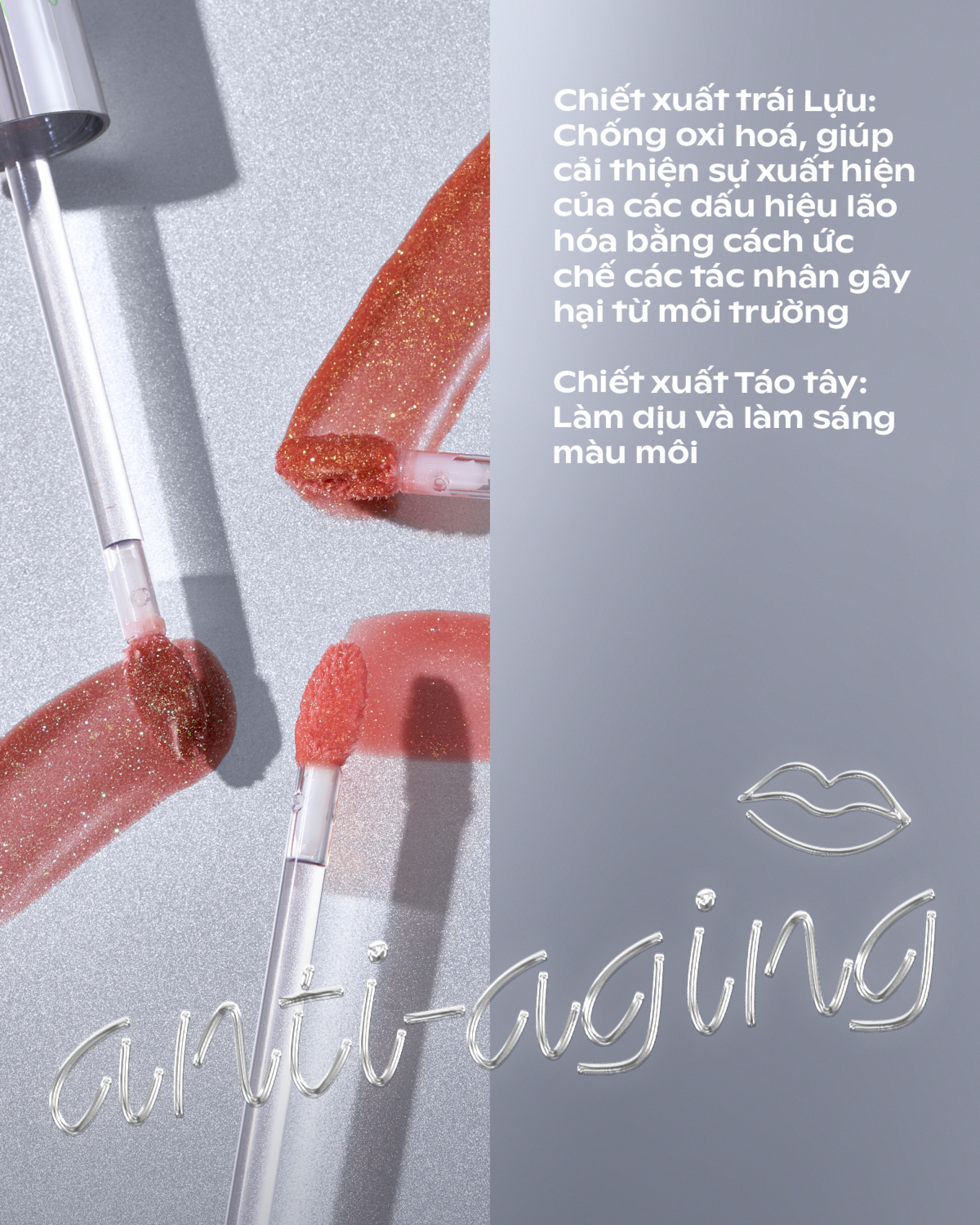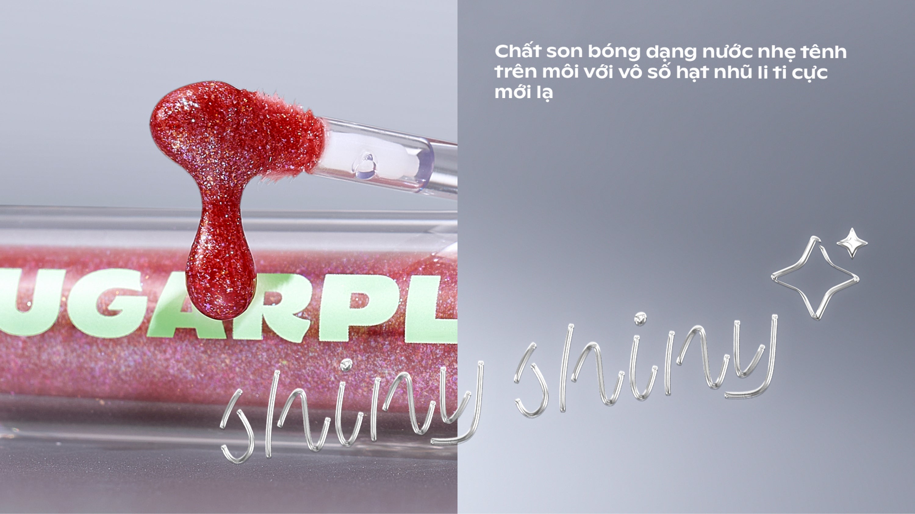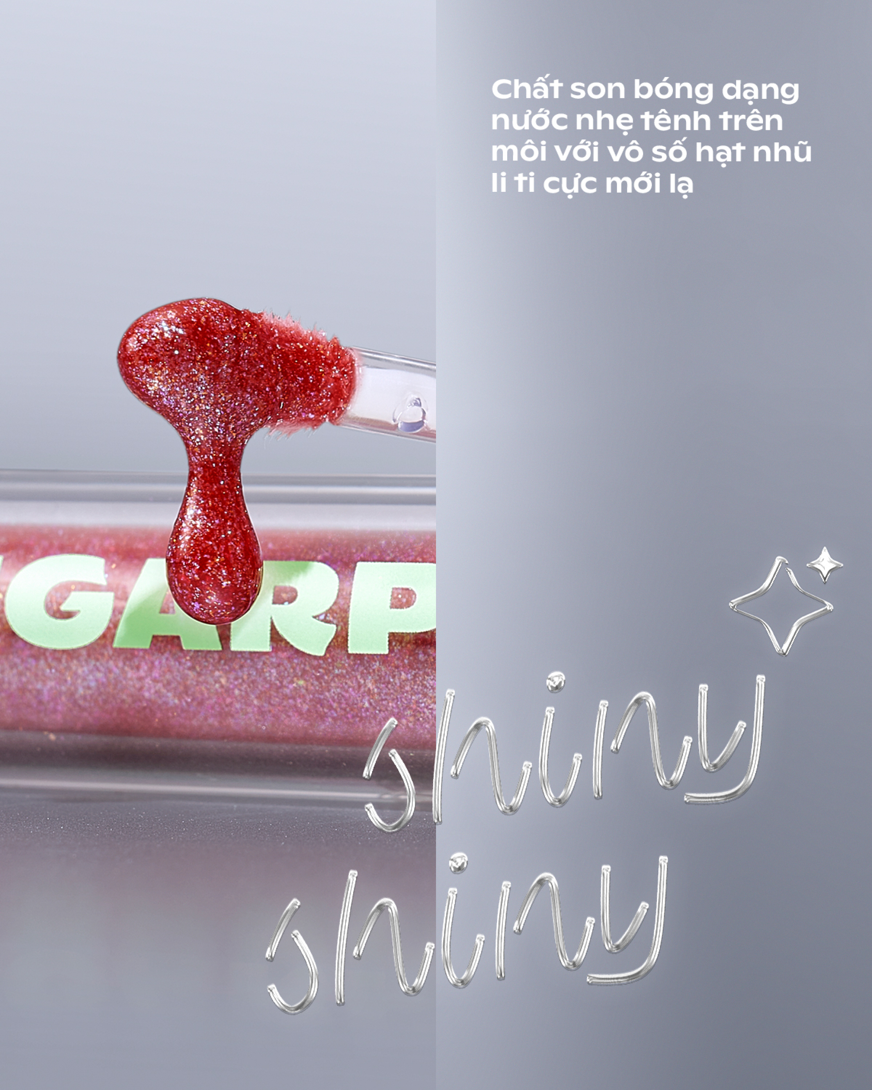 - Son bóng thuần chay dạng nước có nhũ cho nền môi căng mọng, lấp lánh