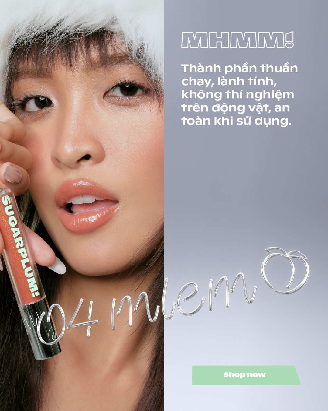 - Son bóng thuần chay dạng nước có nhũ cho nền môi căng mọng, lấp lánh.